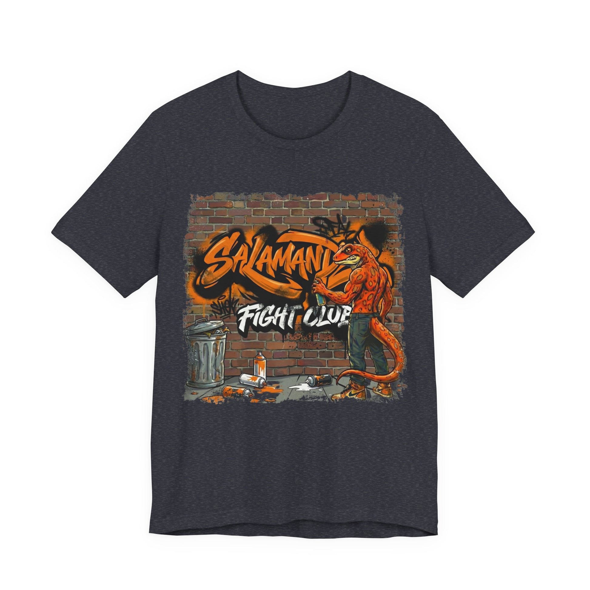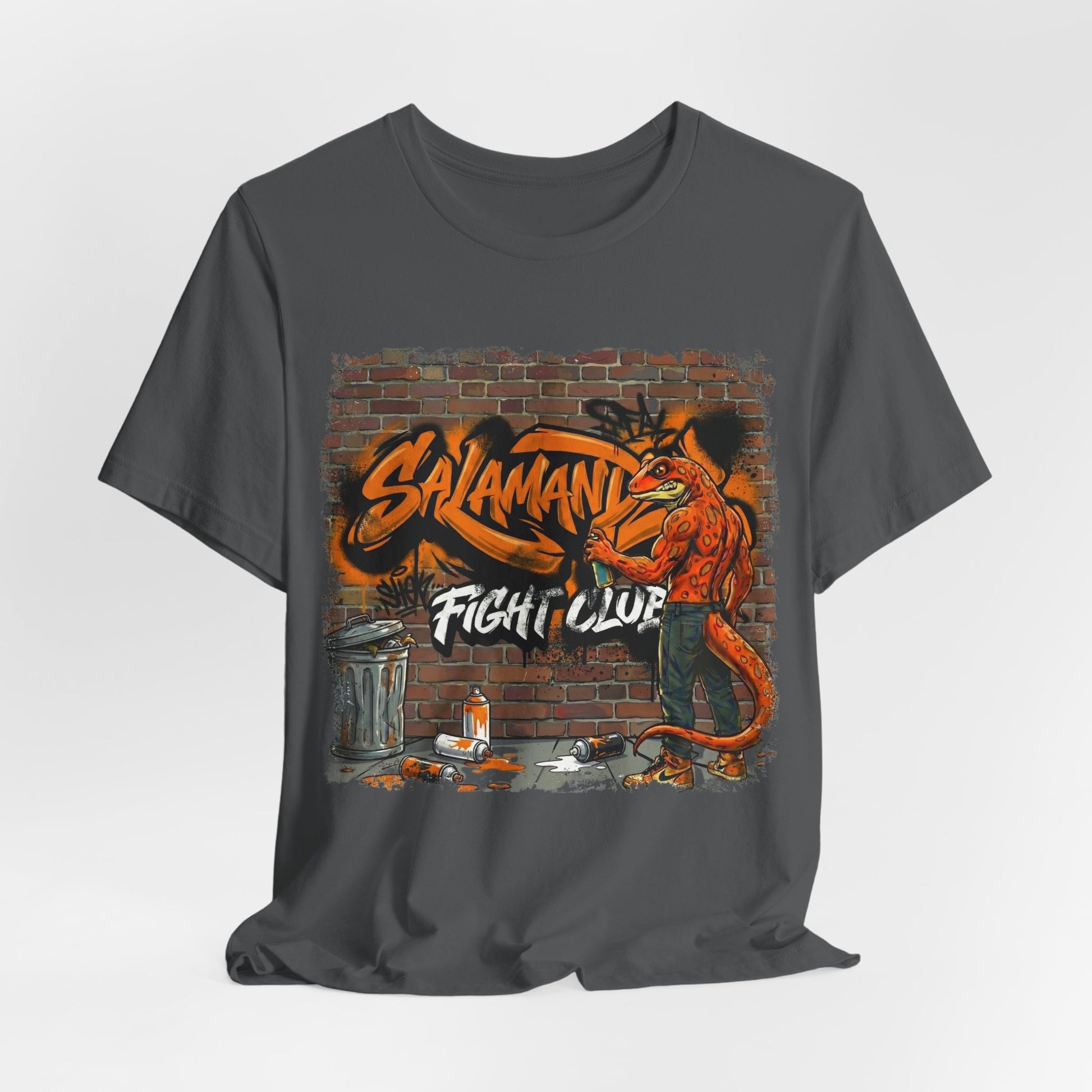 Bold Street Art Graphics The eye-catching design showcases a fierce salamander character spray-painting against a distressed brick wall, complete with urban elements like trash cans and spray paint cans scattered across the scene. The vibrant orange and red colorway pops against the deep black fabric, while the gritty "Salamander Fight Club" lettering adds that essential underground edge.