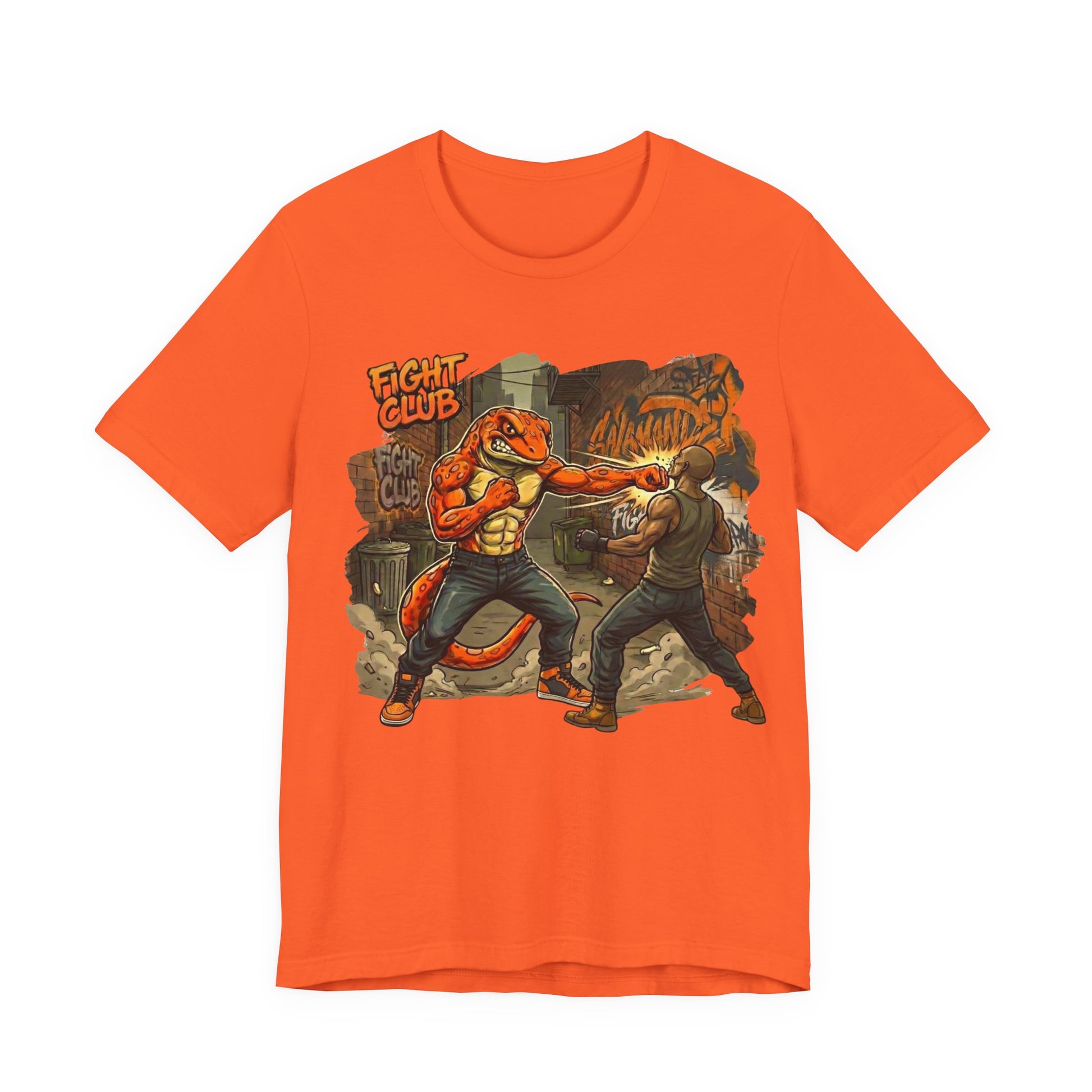 Bold Fight Scene Graphics This design goes hard. Watch the Salamander character mid-punch in an epic backstreet showdown against a street fighter, set in a grimy urban alley complete with trash cans, graffiti tags, and weathered brick walls. The dynamic action scene features explosive orange and yellow punch effects, denim jeans, high-top sneakers, and authentic street fighting stance. "Fight Club" typography blazes across the top in bold orange letters, while "Salamander" and "Backstreet Brawler" tags complete the underground aesthetic.